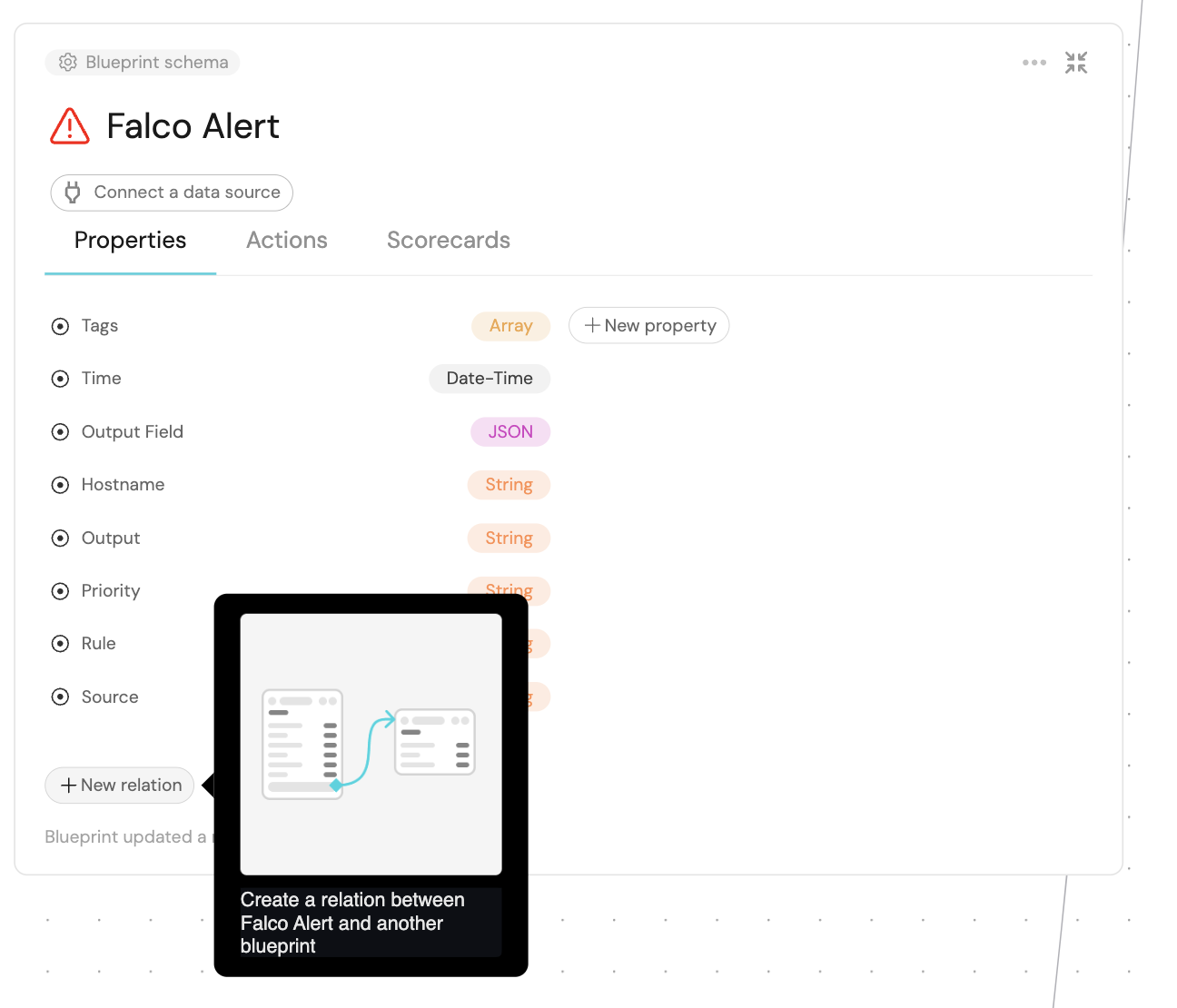 Now that Port is synced with our Falco Alerts, let's reflect the Alert in our resources to display the alert associated with a Namespace. First, we will need to create a relation between our Alert and the corresponding Namespace.