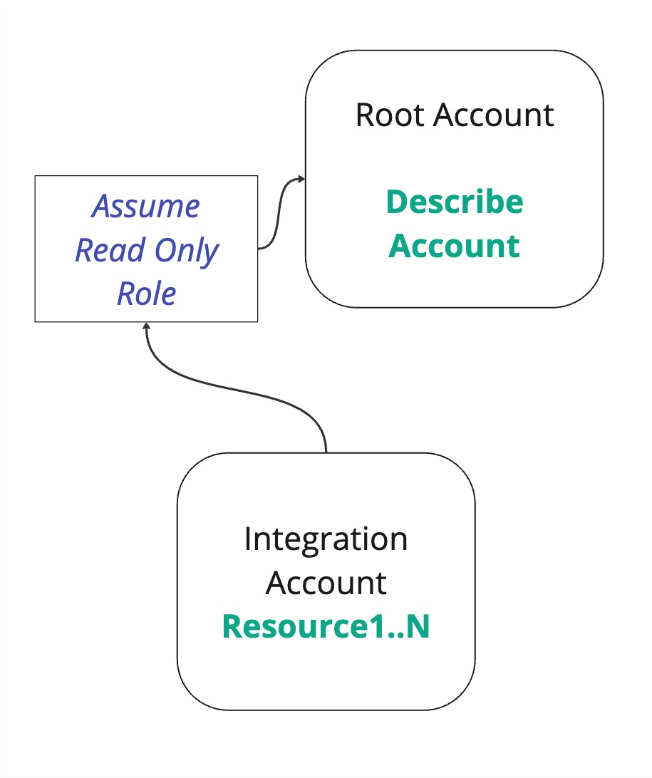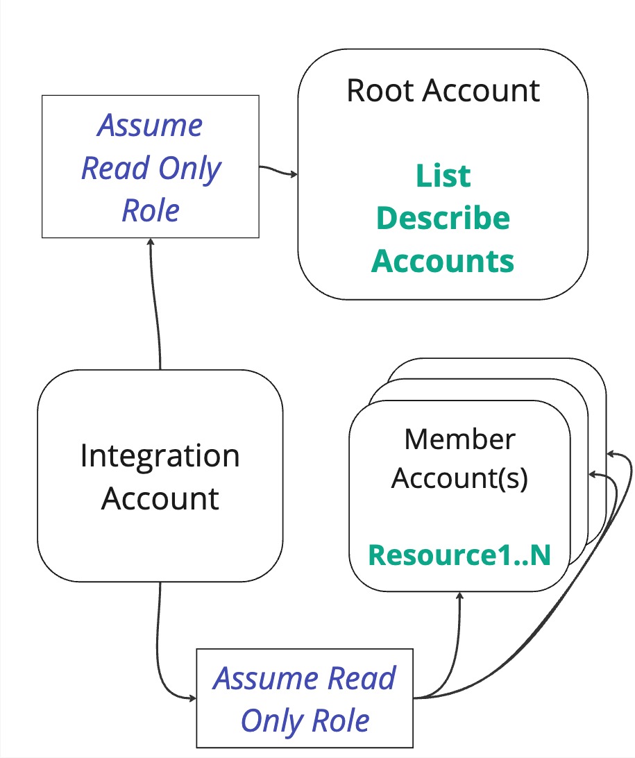 And the final flow that allows data to be read is where the integration account assumes the Root account (to list information about the organization), and in addition, actually fetches the data from the integration account.