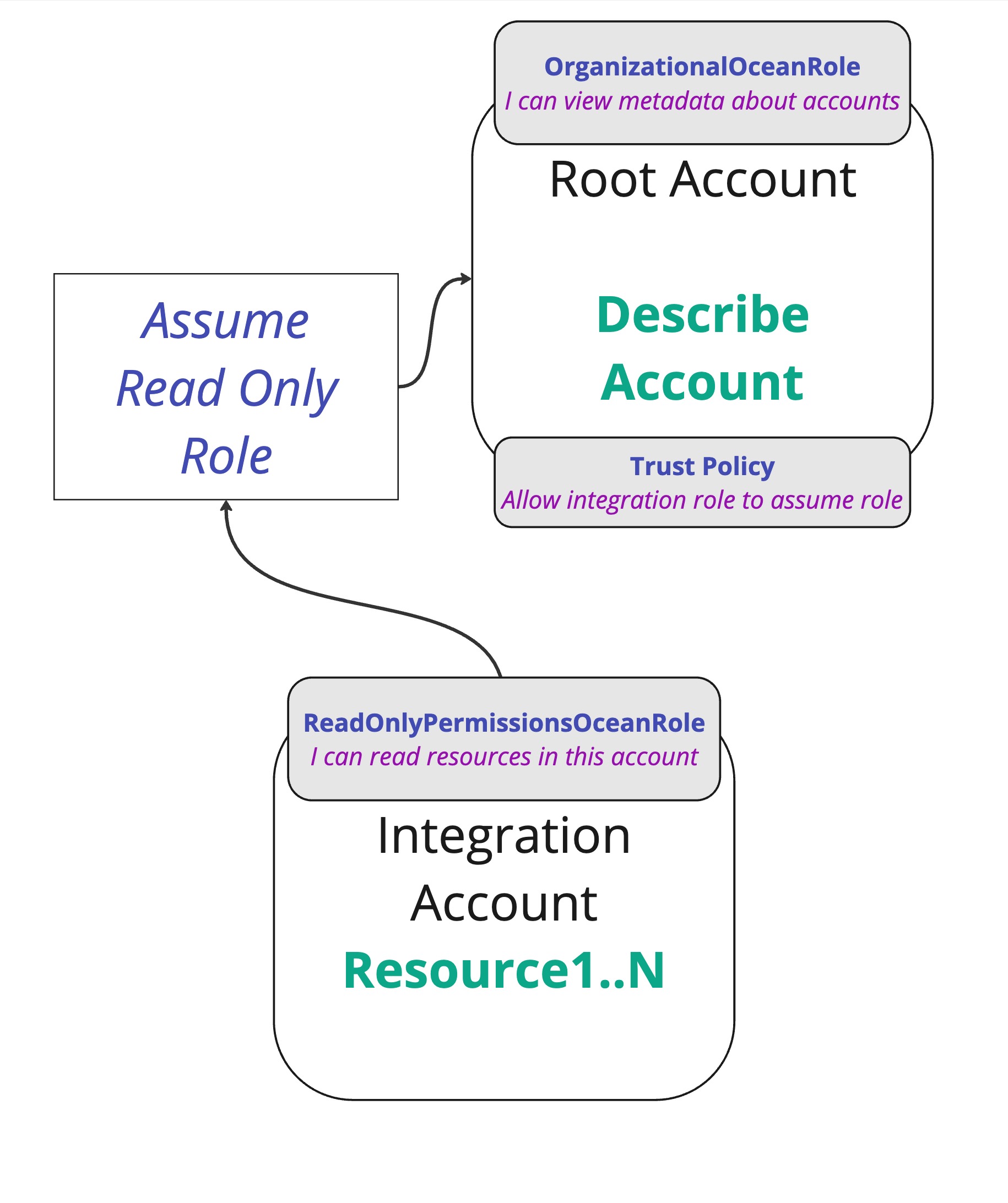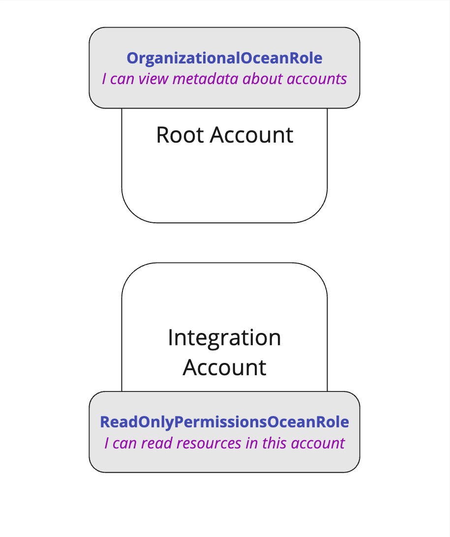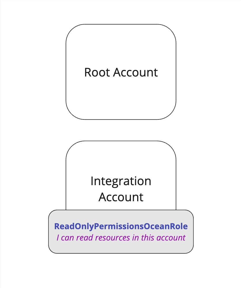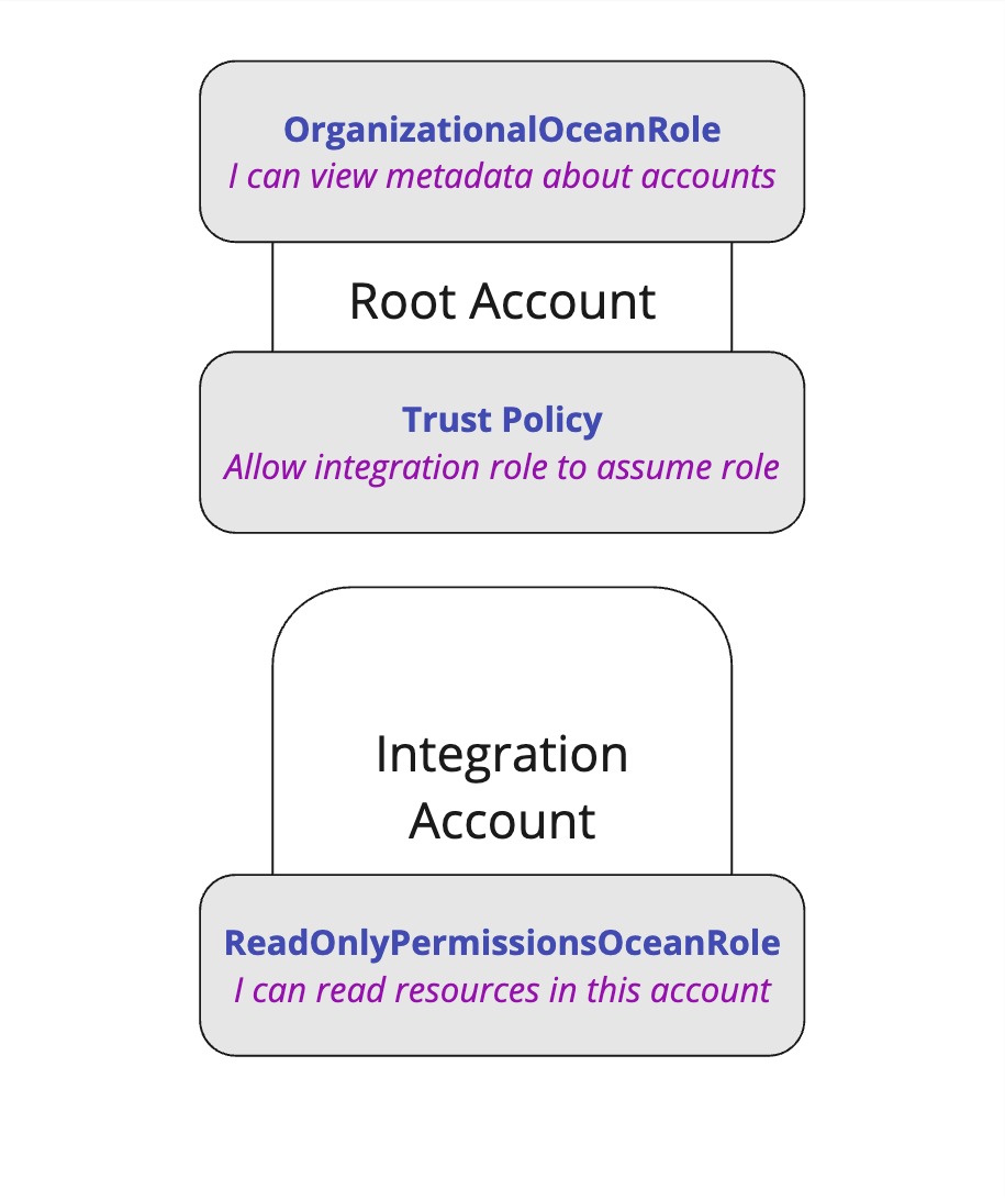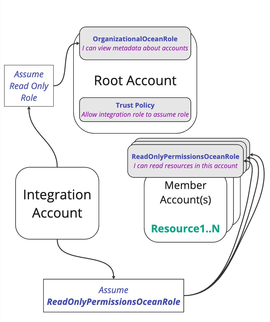 Then, In order for the integration's role to get accounts metadata, We'll need to give our integration role, ReadOnlyPermissionsOceanRole, permissions to assume the role of the root account, OrganizationalOceanRole.