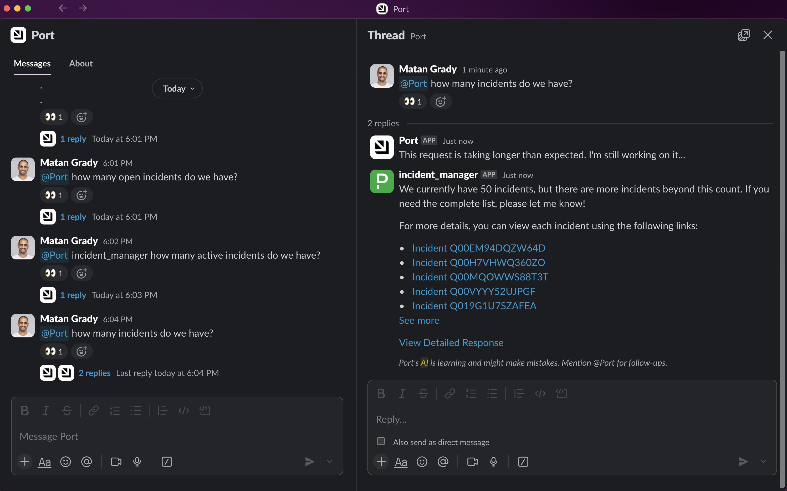 By the end of this guide, your developers will be able to get information about incidents and on-call status via Port's AI chat.
