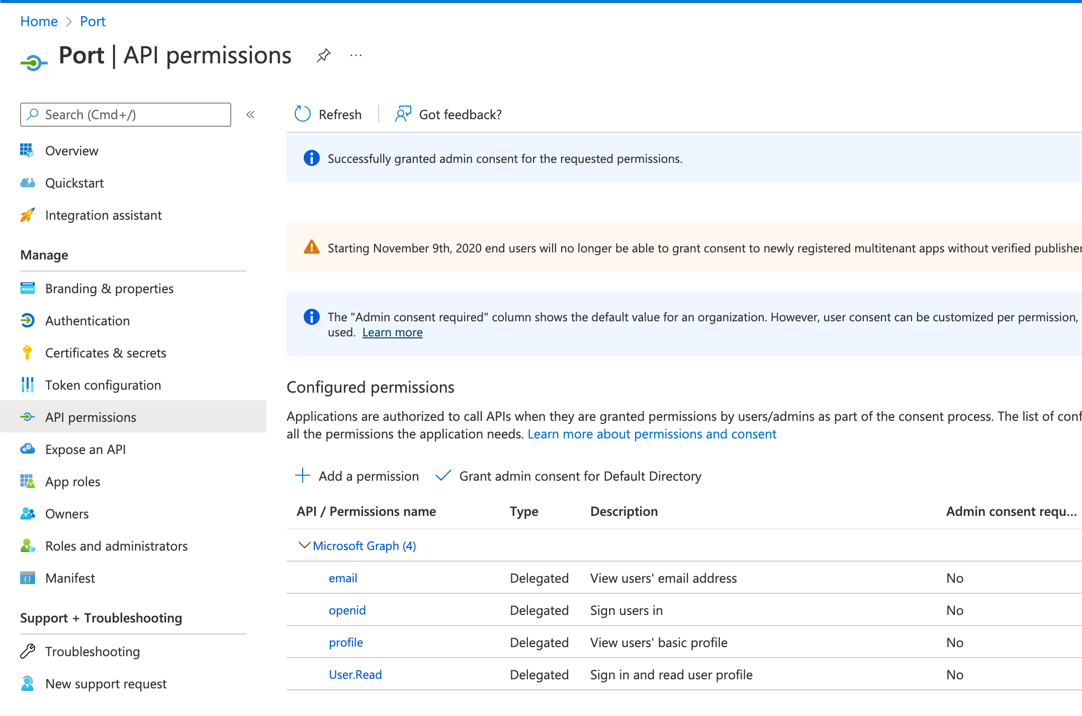 If you wish to pull in AzureAD groups into Port, you will also need to add the Directory.Read.All permission.
