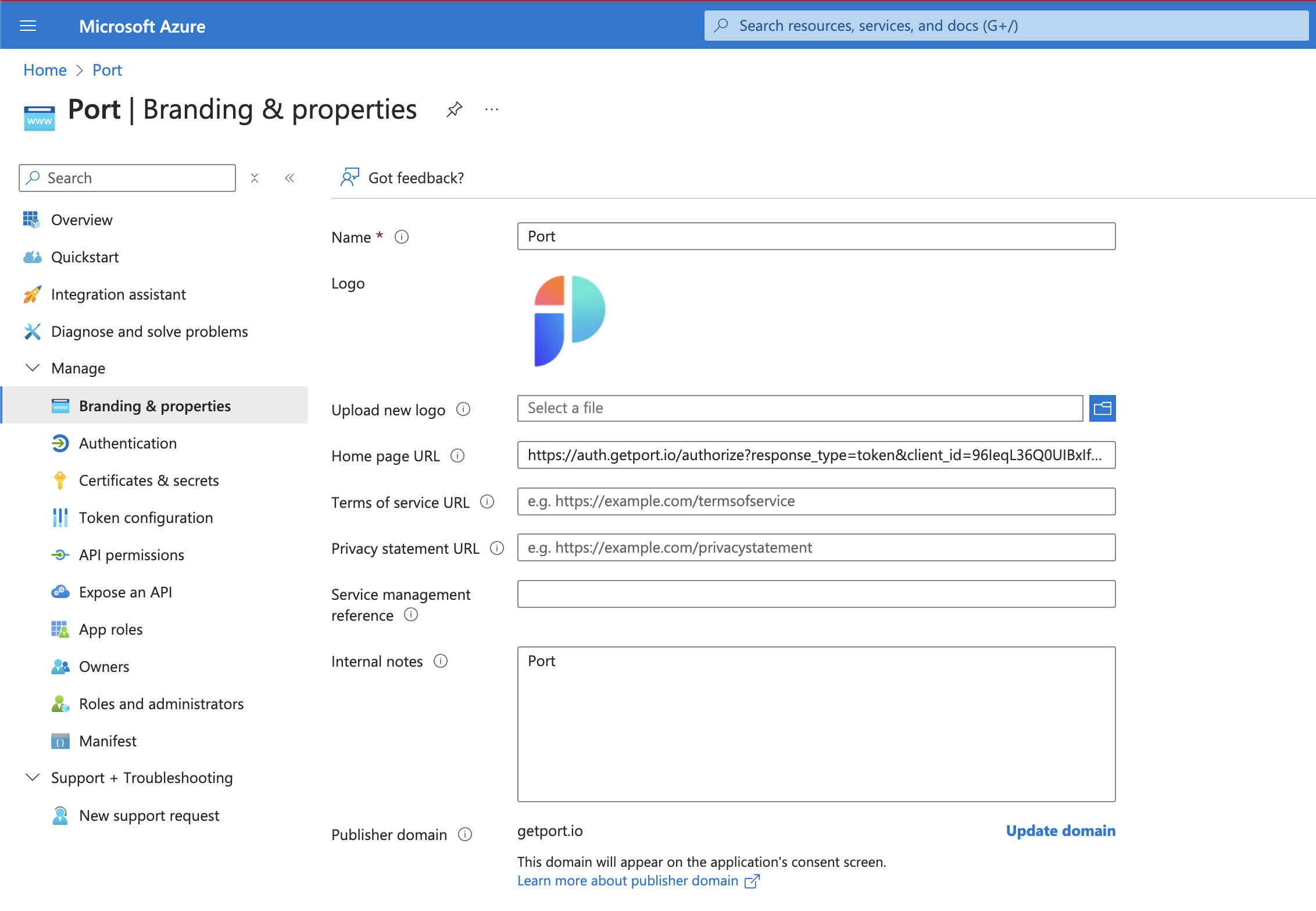 2.2 Publisher domain: Select the domain matching your user emails (for example getport.io).