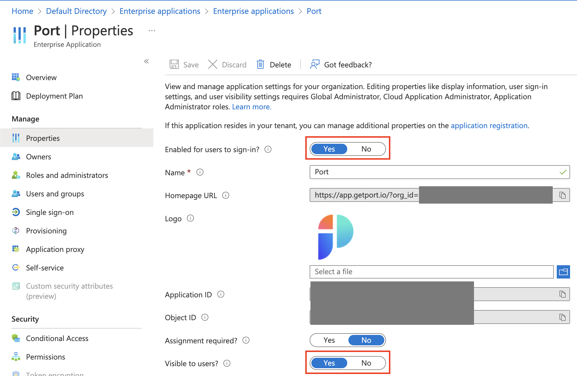 By default the Assignment required? flag is set to No, meaning any user with the Homepage URL to the Port app can access it, even if the app isn't directly assigned to them. Changing the flag to Yes means only users and groups the app is directly assigned to can use and access it.